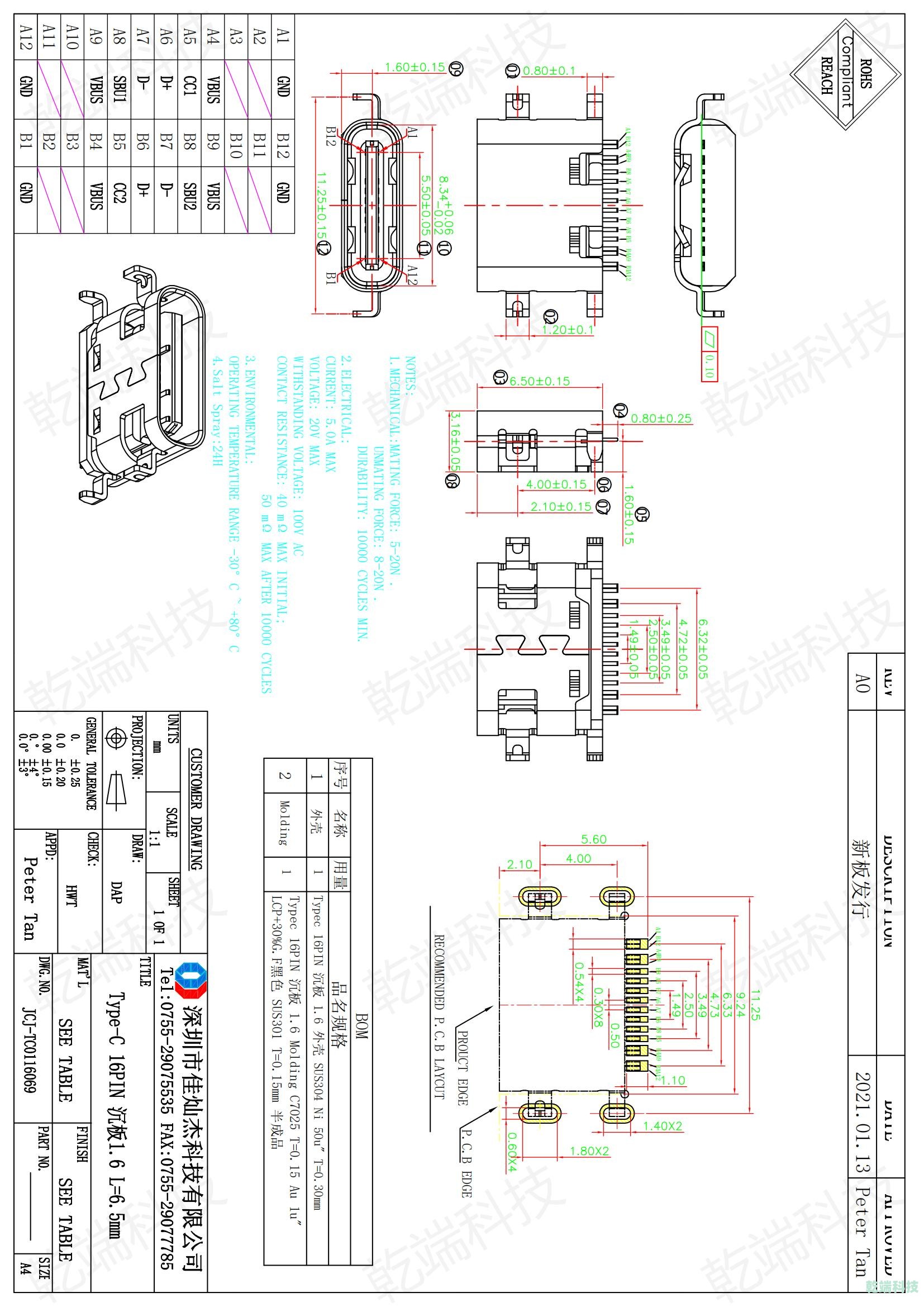 Typec CF 16PIN 沉板 1.6 LCP 黑色 L=6.5mm C7025 1U &(外殼帶彈片)