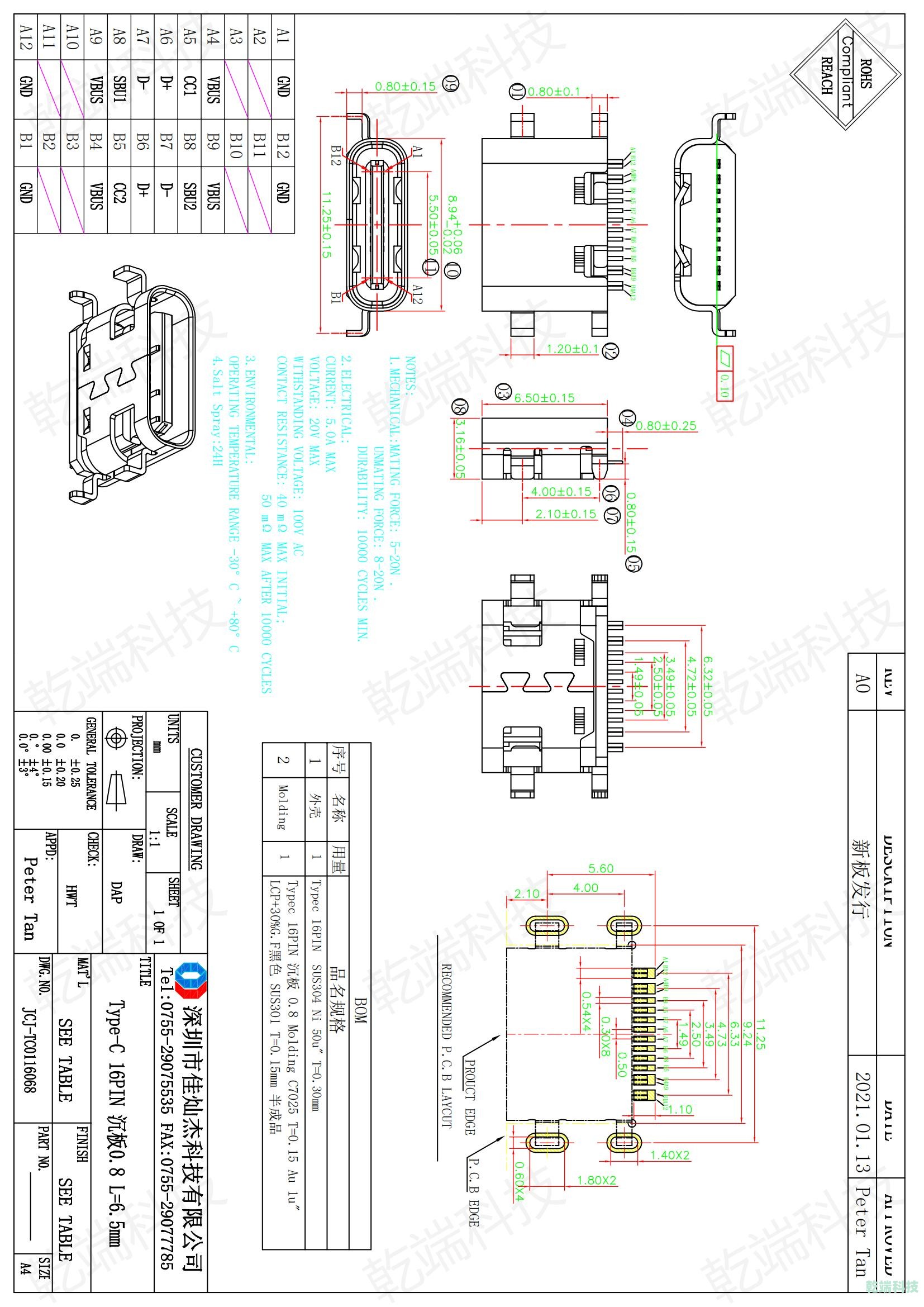 Typec CF 16PIN 沉板 0.8 PA9T黑色 L=6.5mm C7025